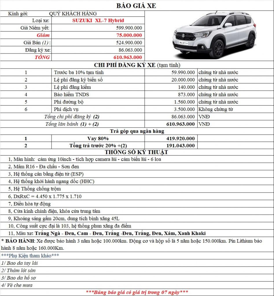 Lưu ý: Bảng báo giá xe suzuki xl7 hybrid – giá lăn bánh trên chưa phải là giá tốt nhất tại thời điểm.